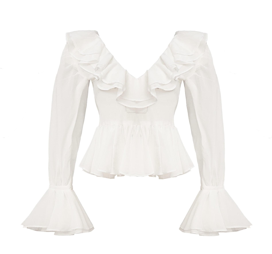 De la mousseline blanche pour apporter de la fraîcheur, un col V souligné par des volants, une coupe péplum et des manches tulipes. Le tout pour inviter les seventies dans votre garde-robe de vacances, un look romantique et chic pour souligner votre féminité. Ajoutez-y un jean flare et vous aurez le combo parfait pour une après-midi balade à flâner dans les rues de votre ville de vacances.