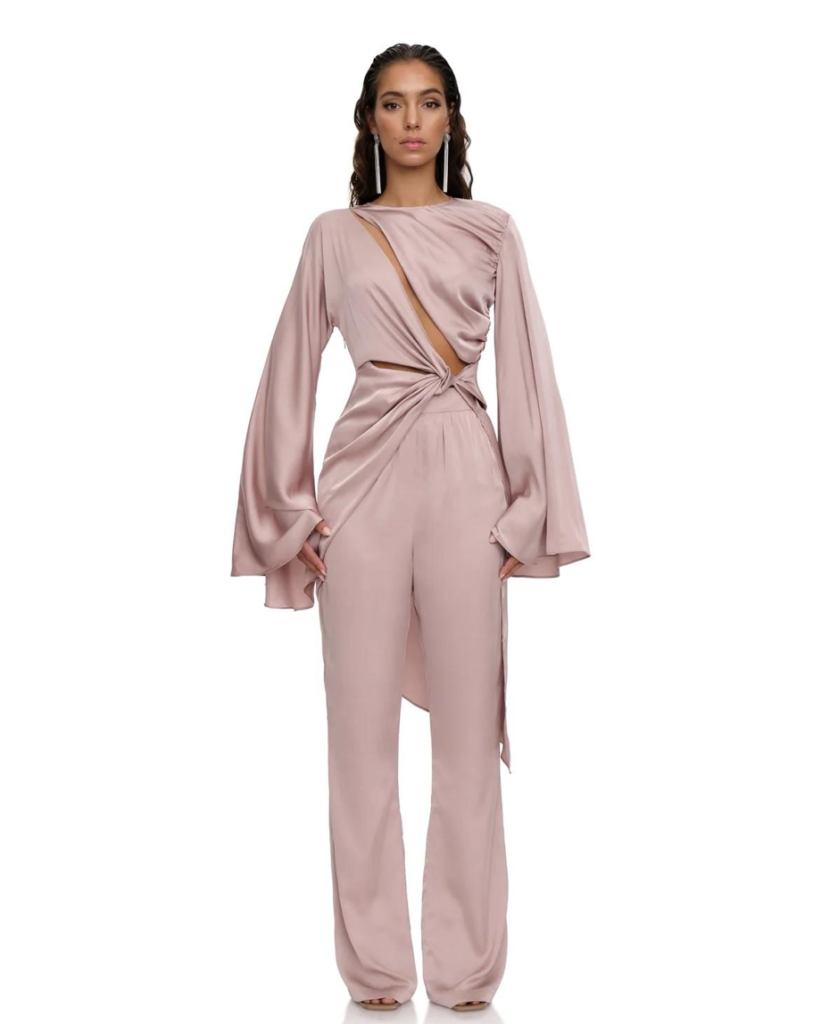 Ce top asymétrique aux détails drapés et de découpe inspire la confiance en soi et éveille la fascination. La couleur rose poudré, la soie et les manches ultra longues et fluides, créent un mélange parfait entre sensualité et sophistication. Il peut très bien s’allier avec un jean pour être porté en journée, ou avec son pantalon si vous voulez aller sur un total look, mais vous pouvez aussi le mettre avec un pantalon d’une autre couleur pour casser l’effet full color. Une chose est sûre, vous ferez un effet garanti avec ce top, où que vous le portiez.