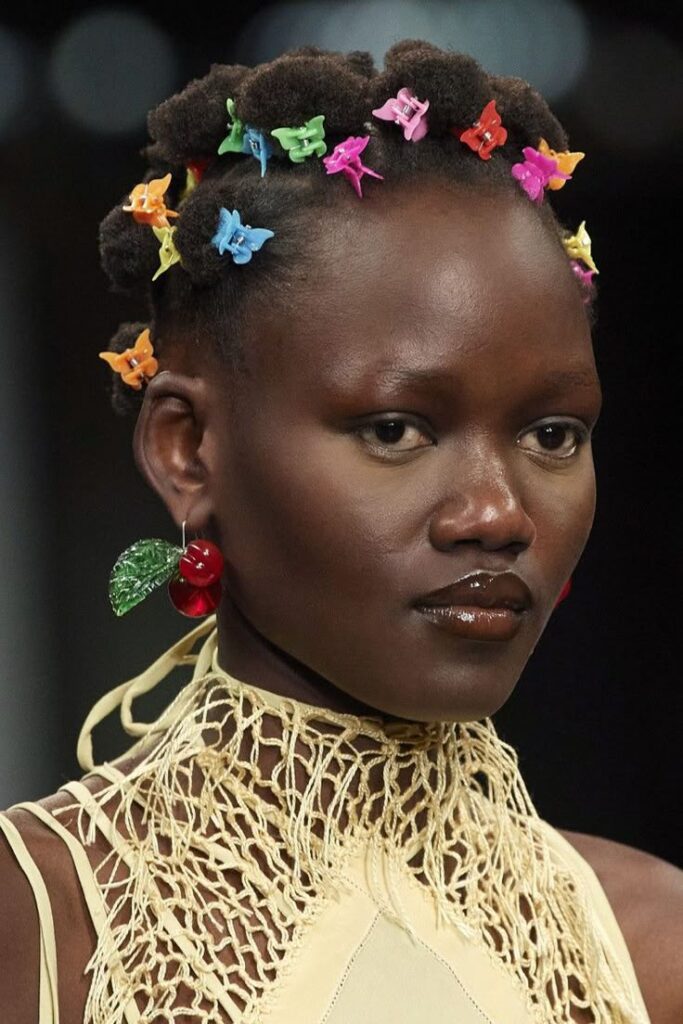 Au-delà des vêtements, la beauté passe par des coiffures : les tresses, les twists, bantu Knott, les coupes structurés, sublimées ou non, par des accessoires colorés et originaux.