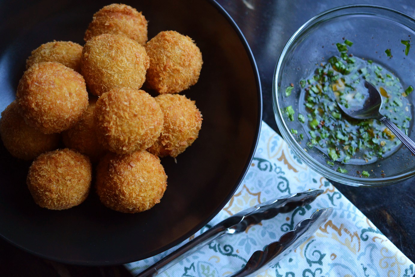 Former avec une cuillère des boulettes. Placez les sur une plaque à pâtisserie et disposez au congélateur pendant 15 à 20 minutes. Faire chauffer l’huile à 190° Celsius. Battre ensemble 1 œuf et le lait. Couvrir les boulettes entièrement de farine. Secouer l’excédent, bien sûr, et les tremper dans le mélange de lait et d’œuf. Recouvrir de chapelure. Et enfin, faire frire dans l’huile chaude jusqu’à coloration dorée et croustillante.