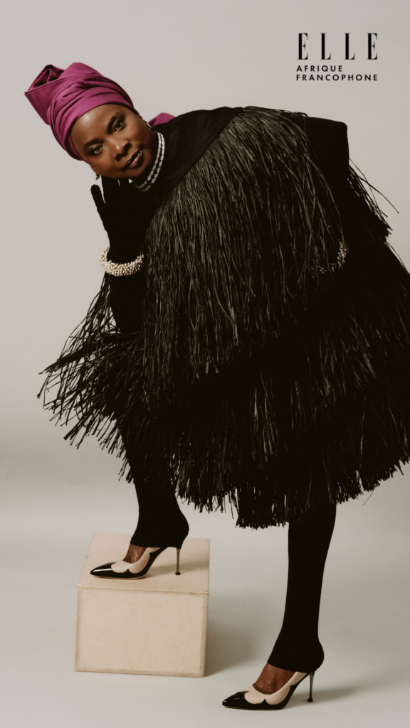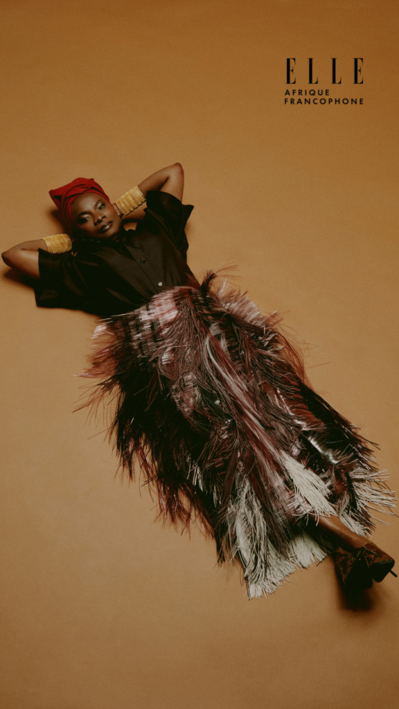 Allongée, Angélique Kidjo prend sa place. La chemise et la jupe à plumes Bottega Veneta, l’une des grandes maisons du luxe discret, celle qui préfère la matière au logo. La jupe, foisonnante et aérienne, contraste avec la sobriété de la chemise : c’est la présence d’une femme qui sait exactement où mettre la puissance. Les escarpins Amina Muaddi, la créatrice jordano-roumaine devenue référence mondiale et les bracelets Maison Kebe ancrent le look dans une modernité africaine assumée.