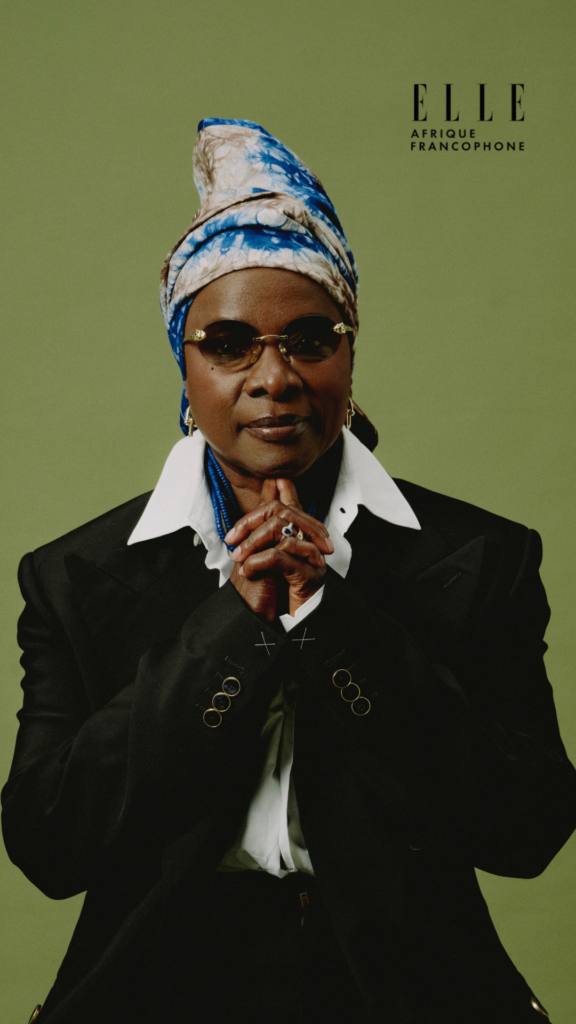 Angélique Kidjo poursuit ce shoot dans un trois-pièces Louis Vuitton signé Pharrell Williams, le directeur artistique qui a fait de la Maison française un espace de célébration de la culture noire. L’alliance est évidente, presque symbolique : deux icônes, une même conviction que l’excellence africaine et afro-descendante mérite les plus grandes maisons. Le turban en tie-and-dye en parfait accord avec le collier Césarée, bijouterie qui puise dans le patrimoine africain, vient briser la rigueur du costume avec une touche d’identité intime et africaine. Aux oreilles, les boucles d’oreilles Tiffany & Co illuminent le visage. La leçon est la suivante : Comment s’approprier le vestiaire masculin avec une grâce absolue ?