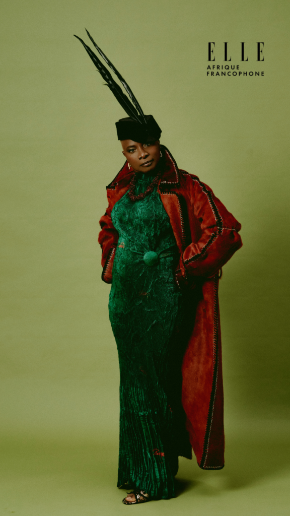 Vert profond. Terracotta. Une plume qui monte vers le ciel. Ce look est une déclaration de pouvoir. La robe DOS Clothing et le manteau Yoshita 1967 créent une palette chromatique audacieuse, presque royale. Mais c’est le chapeau Oriane Belenfant, avec ses plumes verticales qui fait de ce look un monument. Une couronne des temps modernes : On pense aux reines, aux griots, aux femmes qui ont tenu des trônes sans jamais s’asseoir. Les boucles Tiffany & Co et les mules Amina Muaddi ferment la boucle d’une garde-robe sans frontières géographiques.