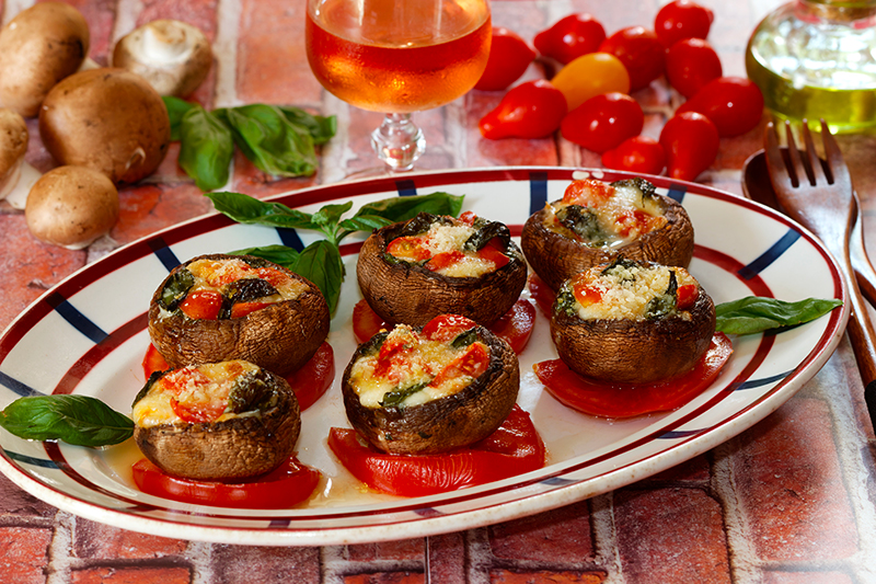 Mélangez ail, huile, sel et poivre. Badigeonnez les champignons. Faites cuire à 200°C (face bombée en haut, puis en bas) pendant 7 à 9 minutes. Ajoutez la mozzarella et les tomates. Faites cuire 2-3 minutes de plus. Servez avec basilic, glaçage balsamique et piment.