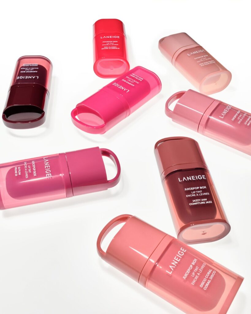 Du côté des textures hybrides, Laneige suit une autre direction avec sa collection JuicePop Box Lip Tint. La formule joue sur une texture fluide, entre sérum et encre, avec une couleur qui tient dans le temps tout en gardant un aspect frais. L’association d’actifs hydratants, de céramides et de polypeptides permet de maintenir le confort tout au long de la journée, sans assécher les lèvres.