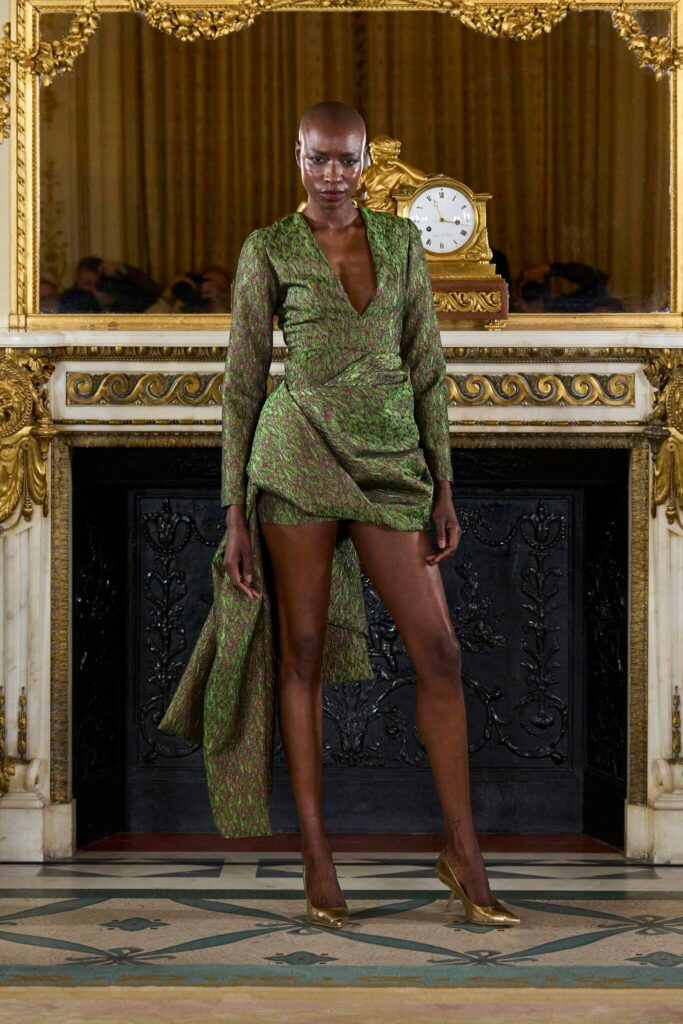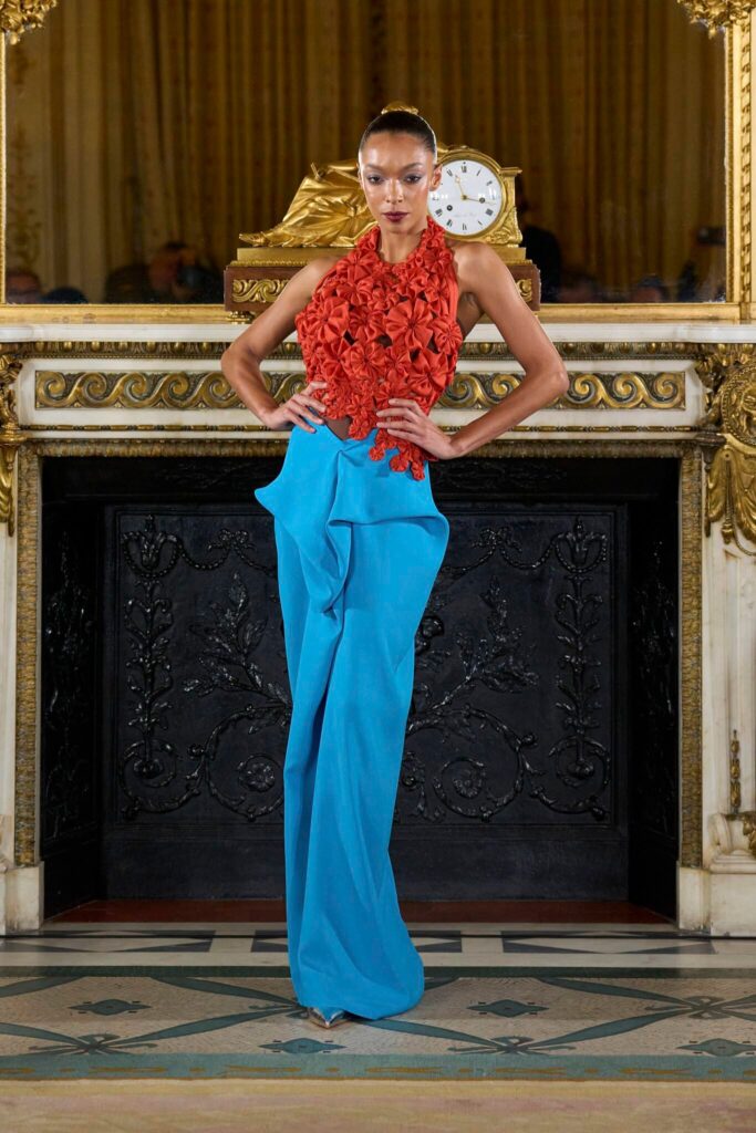 Et c’est précisément là que se révèle la force d’Imane Ayissi. Sa maîtrise de la coupe, des volumes et de la couleur s’exprime pleinement lorsque le vêtement est encore en mouvement. Soies peintes à la main, structures architecturales dont on se demande par quel miracle elles tiennent, robes volontairement ouvertes, décentrées, parfois « inachevées » ; comme souvent dans les défilés. Sauf que ces détails, ici, nous étaient volontairement montrés. Comme un rappel salutaire que le vêtement n’est pas toujours destiné à clore une idée, mais à l’ouvrir.