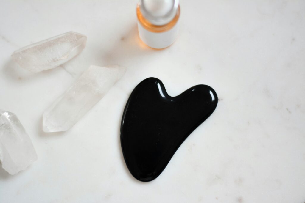 Le guasha peut être réalisé avec différents types de pierres, mais la plus courante est la pierre de jade, réputée pour ses propriétés apaisantes et rafraîchissantes sur la peau. Pour pratiquer le guasha, il est très important d’utiliser une huile ou un sérum pour faciliter le glissement de la pierre sur la peau.
