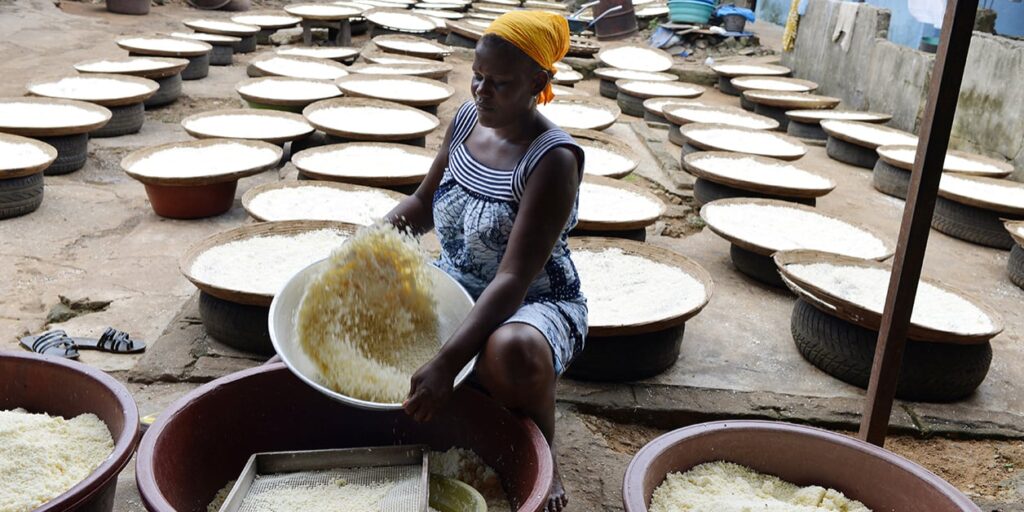 En plus de ses nombreux avantages nutritionnels et culinaires, l’attiéké joue un rôle important dans l’économie locale, en particulier pour l’emploi des femmes en Côte d’Ivoire. La production et la commercialisation de l’attiéké sont majoritairement assurées par des femmes, de la récolte du manioc à la transformation en semoule. Ce secteur représente donc une source significative de revenus pour de nombreuses familles, contribuant à l’autonomisation économique des femmes ivoiriennes et à la promotion de l’entreprenariat féminin.
