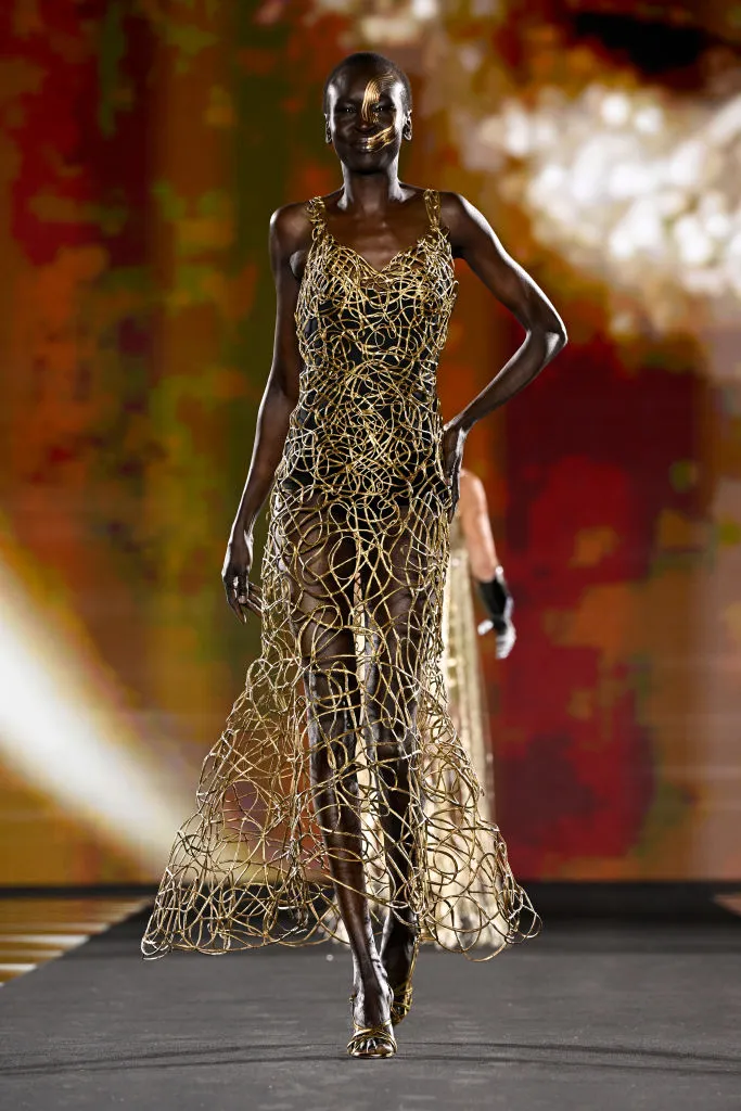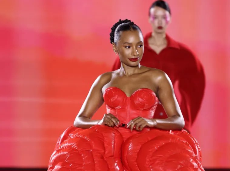 Temi Otedola a fait une entrée remarquée sur le podium dans une robe corset rouge éclatante, en ajoutant une touche personnelle et symbolique à son passage en appliquant du rouge à lèvres L’Oréal avant de faire demi-tour sur le podium.