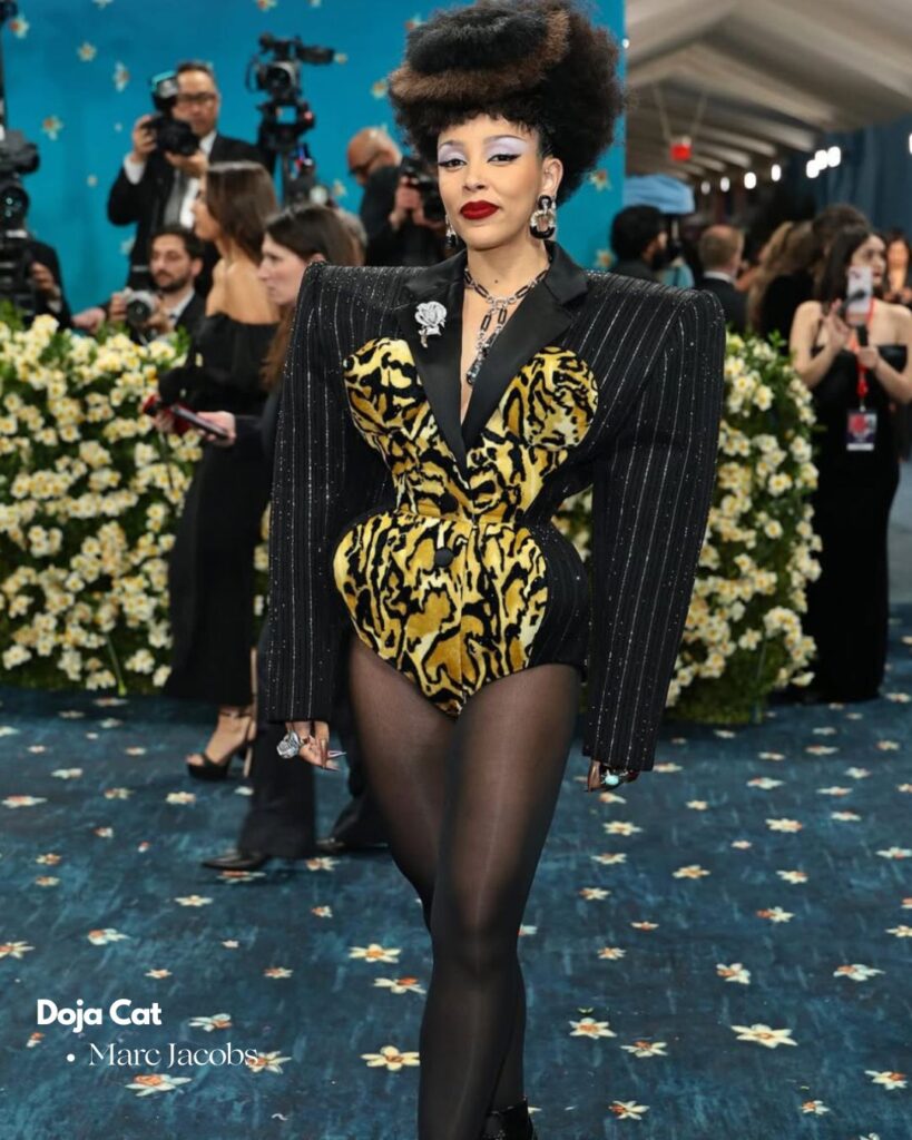 • Doja Cat réinterprétait le zoot suit des années 1980 avec une audace contemporaine, tandis que Janelle Monáe s’affichait en deux tons cubistes, façon sculpture textile.