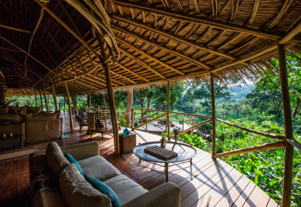 Ngaga Lodge a été construit dans une clairière discrète, entourée d’arbres immenses. Les chambres reposent sur des structures en bois légèrement surélevées afin de préserver le sol forestier. Depuis les terrasses, la vue plonge directement dans la canopée. L’architecture reste volontairement simple. Bois sombre, toits végétalisés et passerelles aériennes permettent aux bâtiments de s’intégrer dans la forêt sans la dominer. Les espaces communs s’ouvrent largement vers l’extérieur afin de laisser entrer la lumière et les bruits de la jungle. Le soir venu, le salon principal devient un refuge chaleureux. On s’y retrouve autour d’un dîner calme, souvent éclairé par la lumière douce des lanternes.