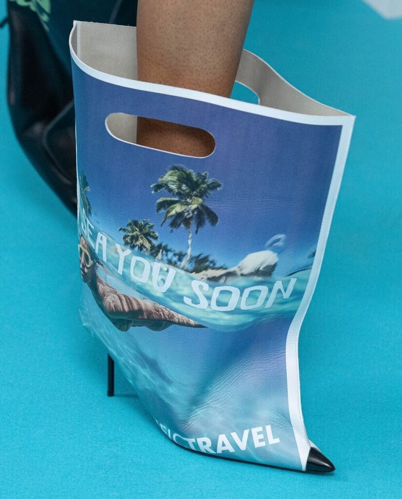 En 2024, Abra, le label du créateur Abraham Ortuno Perez, s’est imposé comme un acteur clé de cette tendance. Ancien créateur pour Loewe et Jacquemus, Perez a fait sensation avec ses escarpins Shopping Bag, fusionnant l’élégance des talons avec le design fonctionnel des sacs de courses.