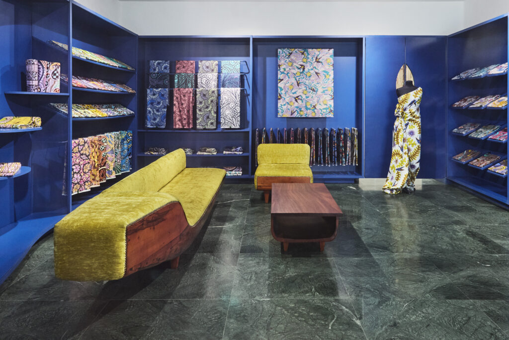 Les œuvres d’art congolaises dialoguent avec le mobilier sculptural du designer ivoirien Jean Servais Somian, qui a façonné pour l’occasion des pièces uniques, mêlant tradition et avant-garde. À l’extérieur, une pergola et un jardin offrent un lieu de respiration et de rencontre, confirmant que cette boutique est autant un espace de culture qu’un temple de mode.
