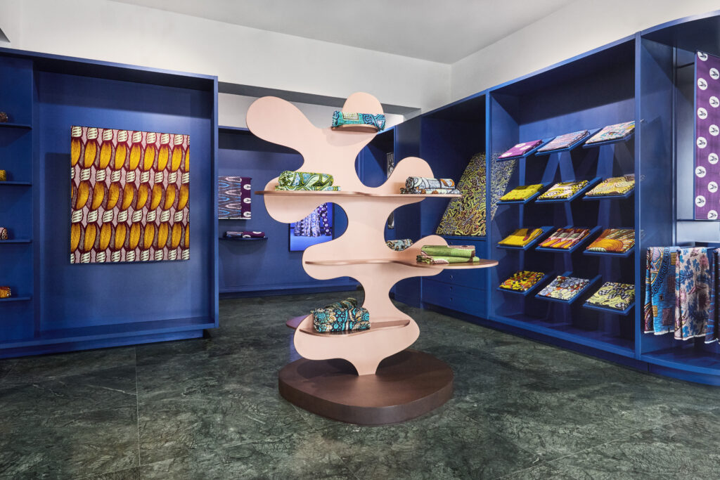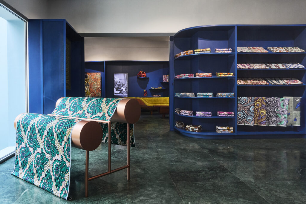 Au-delà de l’architecture, c’est la richesse textile qui fascine : Satin Royal, Grand Super-Wax et Radiance, le premier jacquard tissé de Vlisco habillent l’espace. Présentés sous une lumière étudiée, ces tissus révèlent toute la virtuosité des couleurs et des motifs, fidèles à la réputation de la maison. Chaque étoffe raconte une histoire, prête à être réinventée par celles et ceux qui la portent.